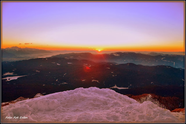 Ko se odpraviva s parkirišča na Rudnem polju je še tema...vrh Viševnika pa tudi ni tako daleč. Med vzponom začneva opazovati že znane barve na vzhodu. Na vrh prideva ravno pravi čas, da vidiva sončni vzhod. Mrzlo je bilo in na trenutke kar vetrovno. Razgledi lepi in čisti...